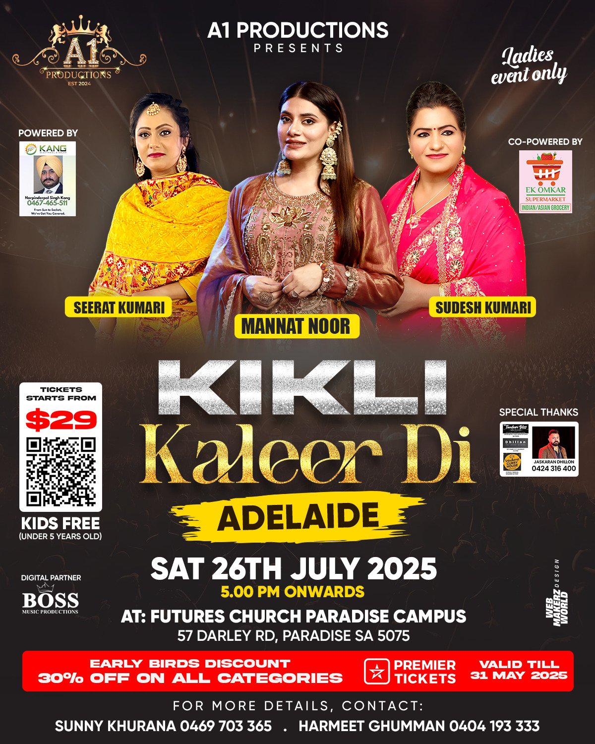 Feel the excitement build as Kikli Kaleer Di live in Adelaide promises unforgettable energy with renowned artists Mannat Noor, Sudesh Kumari, and Seerat Kumari. Whether you’re planning to witness the Kikli Kaleer Di live event in Adelaide, groove at the Kikli Kaleer Di live show in Adelaide, or sing along at the Kikli Kaleer Di live concert in Adelaide, every beat will lift your spirit. Make plans to step into an atmosphere full of rhythm, joy, and dazzling performances that will leave lasting memories.